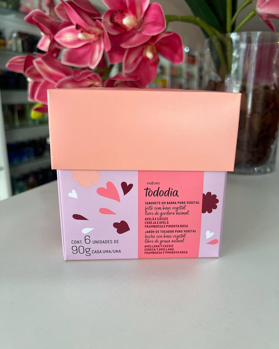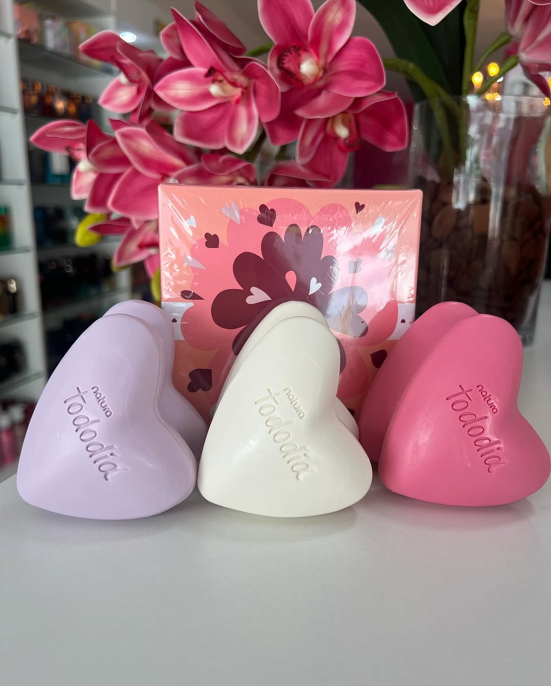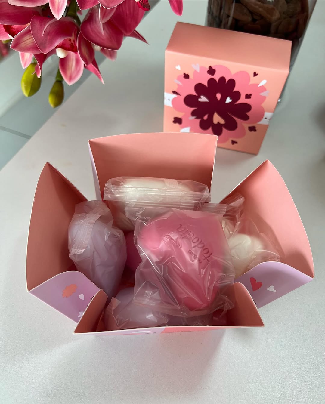 La caja contiene 6 jabones en forma de corazón de 90g cada uno