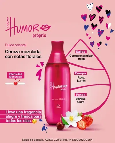 Humor Proprio es la dulce fragancia llena de personalidad del portafolio de la marca. Tiene una lectura innovadora de la cereza, aportando el lado dulce del almíbar a su composición.
