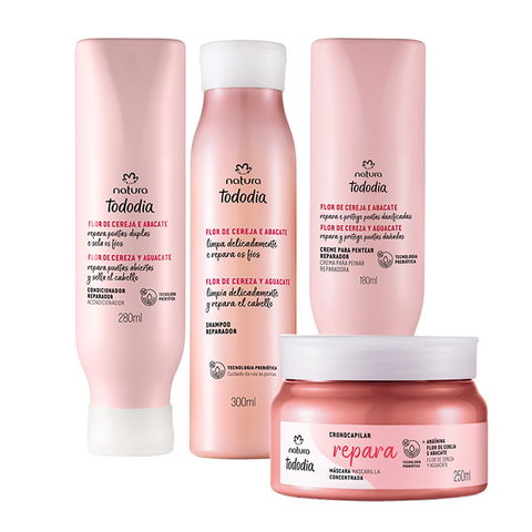 KIT REPARACION FLOR DE CEREZA Y AGUACATE Revitaliza y repara tu cabello dañado por procedimientos químicos con esta línea enriquecida de ingredientes naturales.