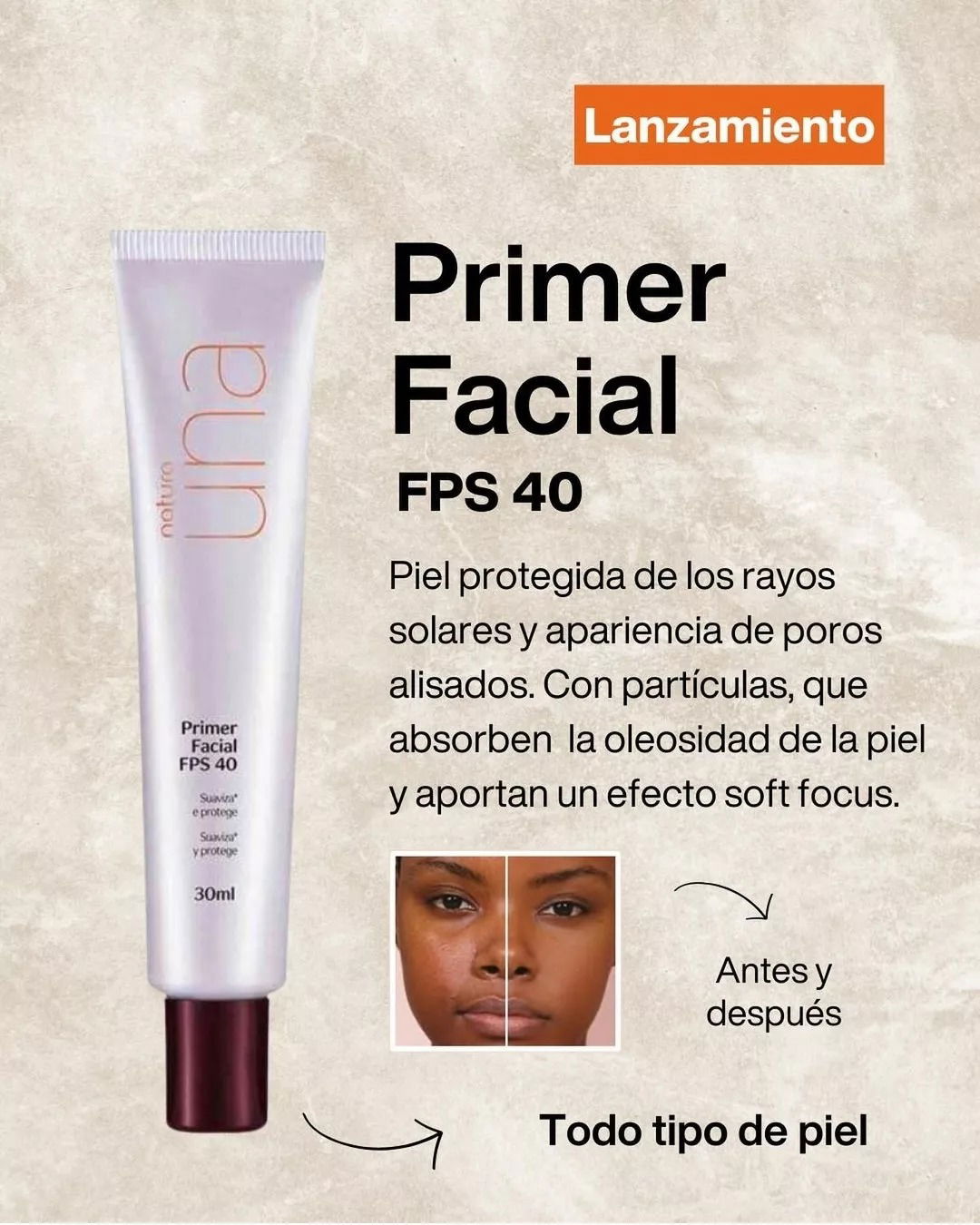 Suaviza la apariencia de los poros y las líneas finas. Tacto seco y duradero.